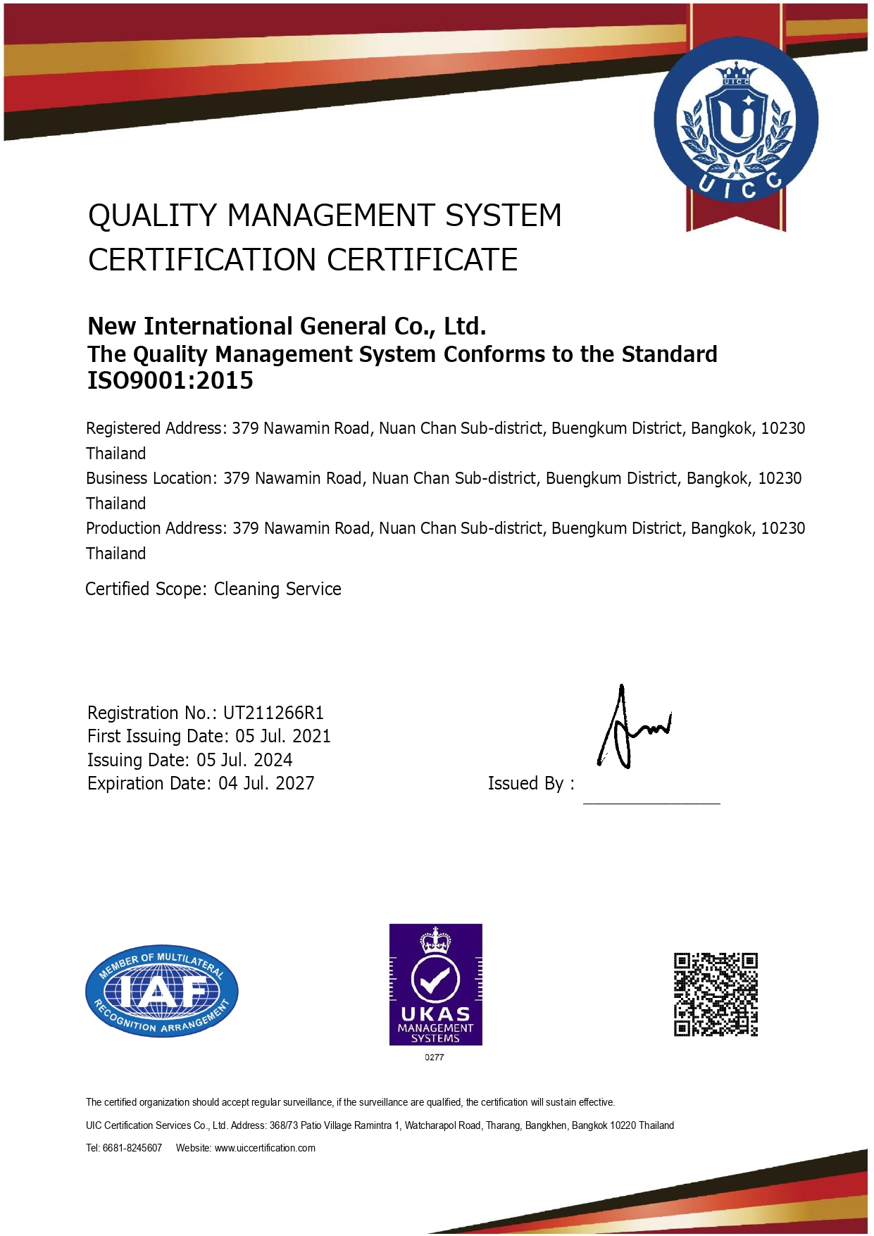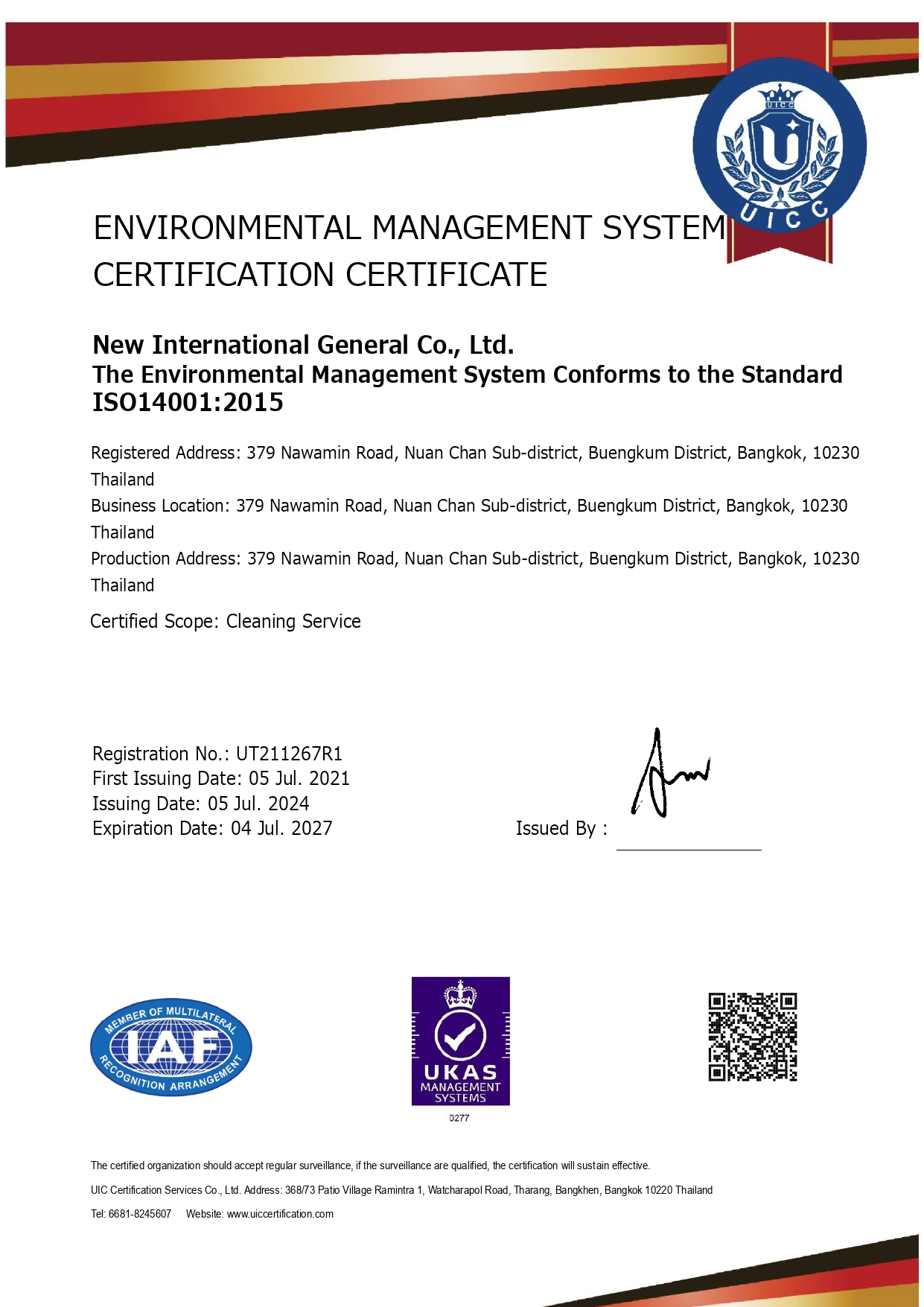 “สะอาดอย่างใส่ใจ ดูแลโลกไปพร้อมกัน ” โดยได้รับรอง การรับรองระบบบริหารงานคุณภาพ ISO 9001:2015 และระบบมาตรฐานระบบการจัดการสิ่งแวดล้อม ISO 14001:2015 มาตรฐานของระบบการทำความสะอาด ภายใต้มาตรฐานจากประเทศอังกฤษ (British Standard) EN13549:2001 มาตรฐานการจัดการอาชีวอนามัยและความปลอดภัย ISO 45001:2018